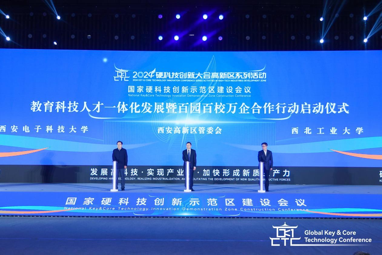 活动现场举行了教育科技人才一体化发展暨百园百校万企合作行动启动仪式。据介绍,“百园百校万企”创新合作行动是工业和信息化部、科技部、教育部联合组织的创新合作行动,旨在促进教育、科技、产业深度融合。西安高新区将与西北工业大学、西安电子科技大学共同实施成果转化对接、联合技术攻关、产教融合育才、创新平台建设四大行动,把教育科技人才优势统筹为产业发展竞争优势,为实现高水平科技自立自强、推动新型工业化、发展新质生产力提供有力支撑。