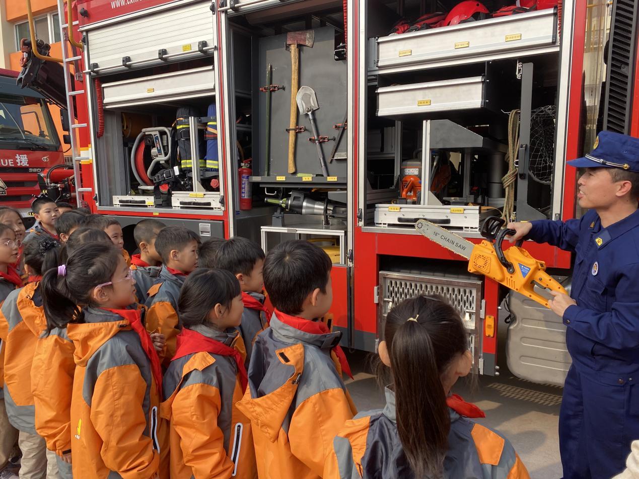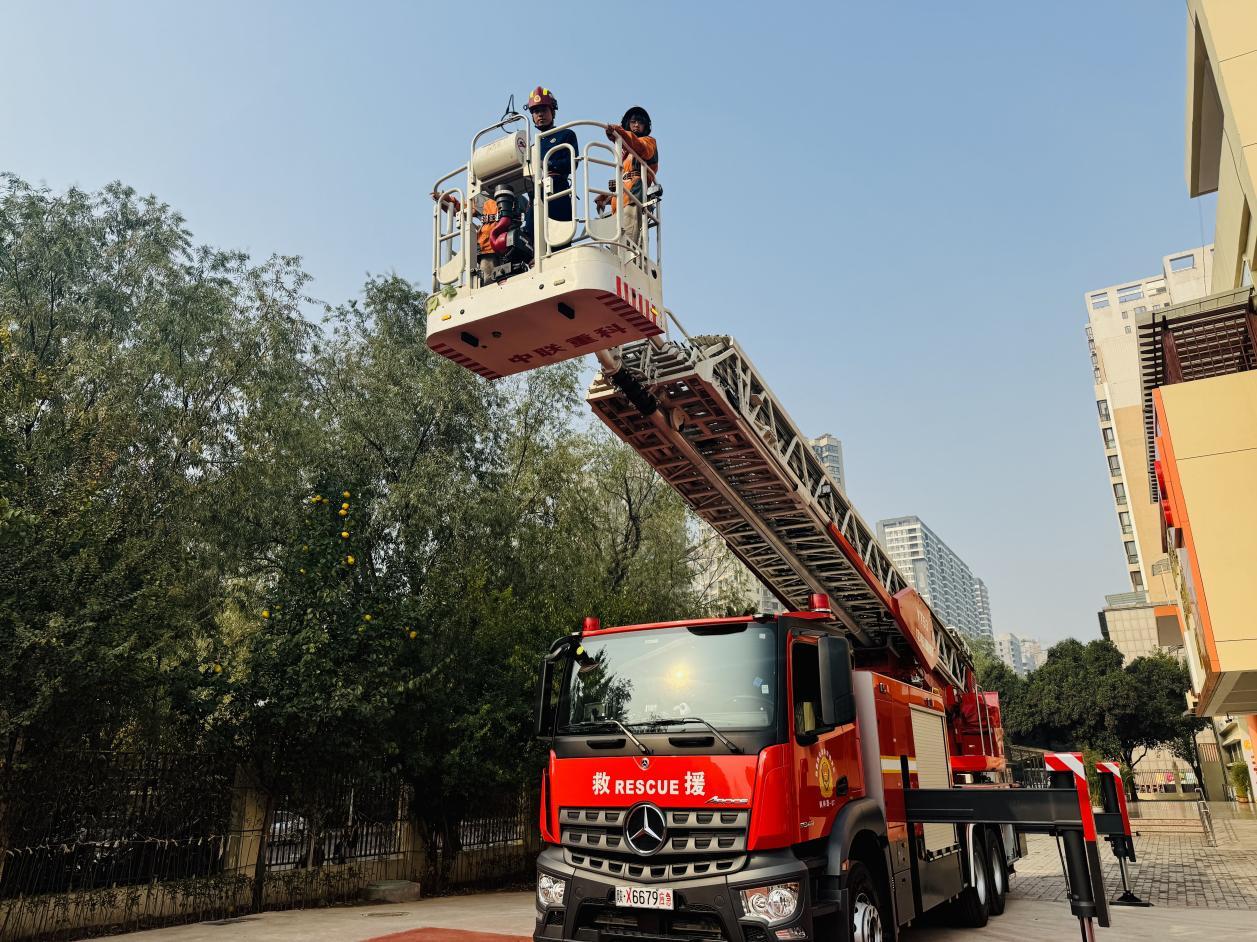 这场模拟真实情境的演练中,每个环节都开展的井井有序,在演示灭火的过程中,消防员叔叔有的用18米高喷消防车展示高空喷水,有的登上53米的云梯消防车,向同学们展示高空救援,同学们还在消防员叔叔的带领下参观了抢险救援车,了解了不同的消防救援装备。在此过程中,同学们有的亲身体验,有的发出阵阵惊呼,纷纷感叹,这些高科技的装备太震撼了,在脑海中勾画出消防员叔叔救火时的情景。