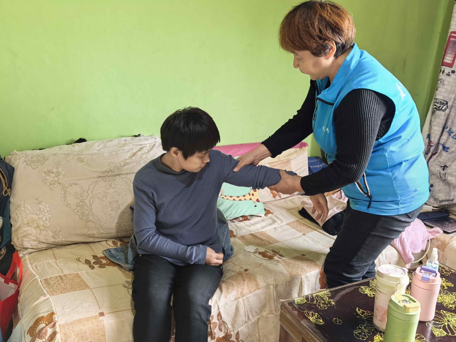 在汉城街道贾村社区的这个小家庭里,小芳的遭遇令人动容,先天性智力残疾加上幼时发烧引发的癫痫,让她失去了表达和理解能力。杨雄梅每次来除了教小芳识字、叠衣服这样的生活技能,还会用专业的设备或是用艾灸为小芳做理疗、按摩肌肉,以此来缓解癫痫后遗症。“小杨就像芳芳的‘启明星’,每次来都会教芳芳一些技能,要么叠衣服,要么读书识字。以前我从未想过让小芳学技能,是小杨的细心让我意识到了这一点。‘菜单式服务’真的帮到我们很多。”小芳的妈妈感慨道。