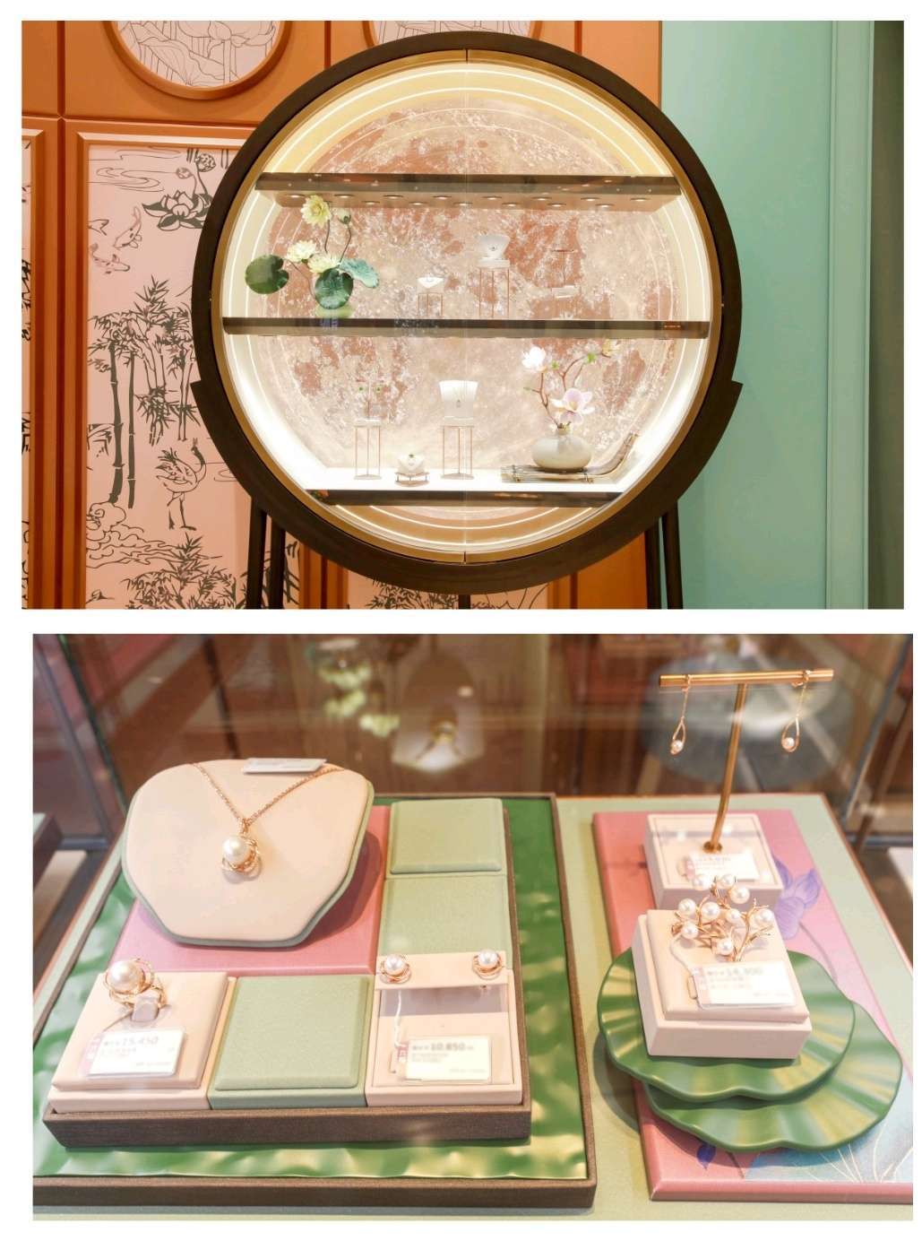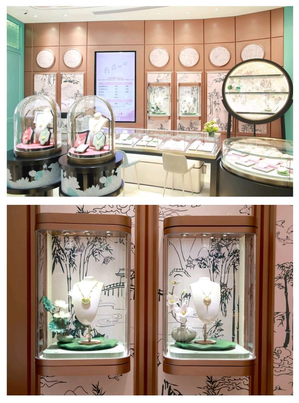 店内无论是形象墙、道具柜台,还是摆件装饰,都融入荷花、荷叶、莲蓬的元素点缀出轻盈优雅,搭配柔和的粉色,宛如一幅“荷塘月色”画卷,与款式精美、韵味满满的饰品,共同营造出一个东方诗意的珠宝美学空间,为大家带来轻松愉悦的购物体验。