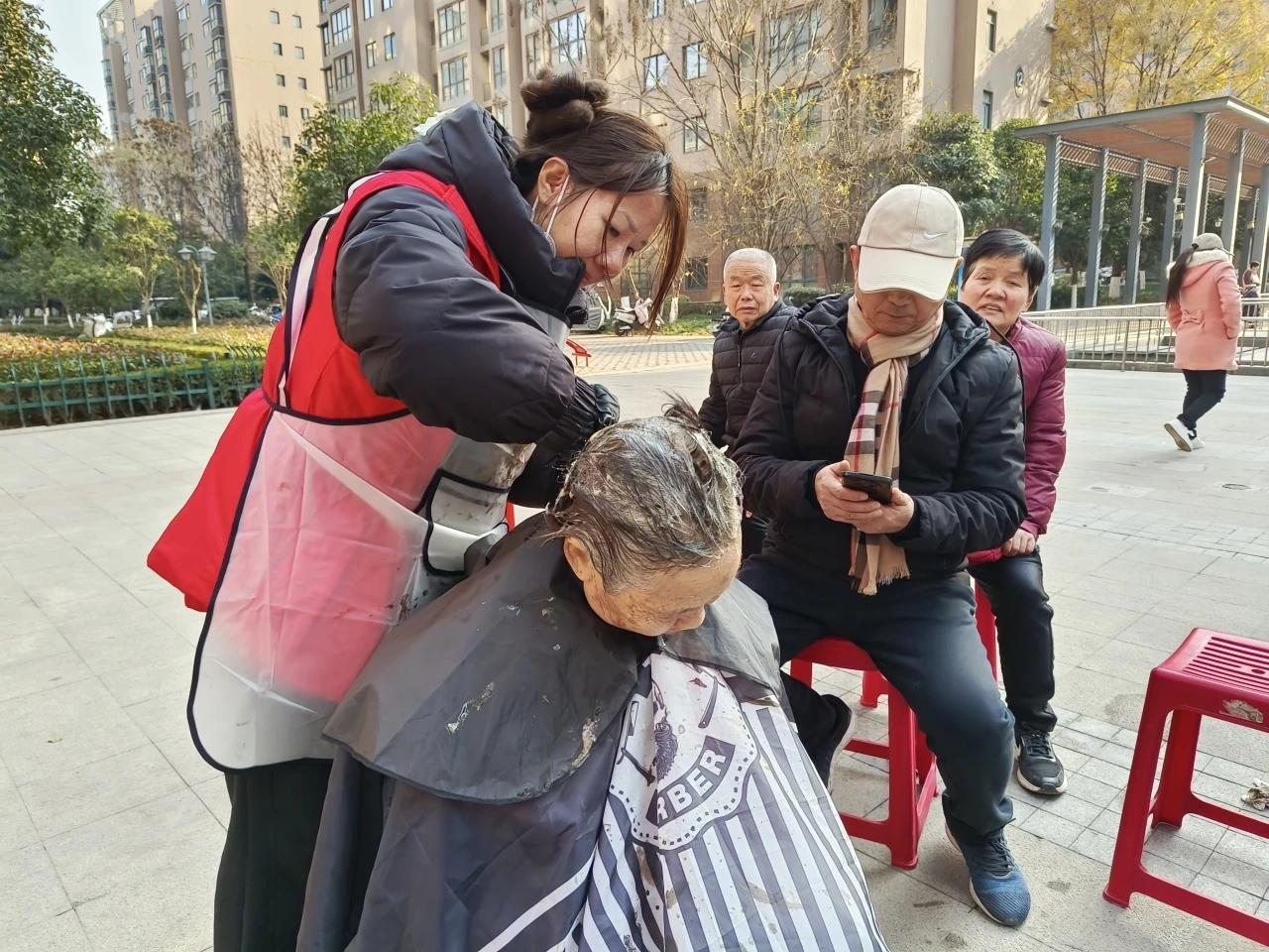 染发志愿者手持染发剂,如同神奇的魔法师,将一缕缕银丝染成乌黑或者时尚的彩色。居民们坐在椅子上,眼神里充满期待和喜悦。当看到镜子里焕然一新的自己时,他们的脸上绽放出灿烂的笑容。