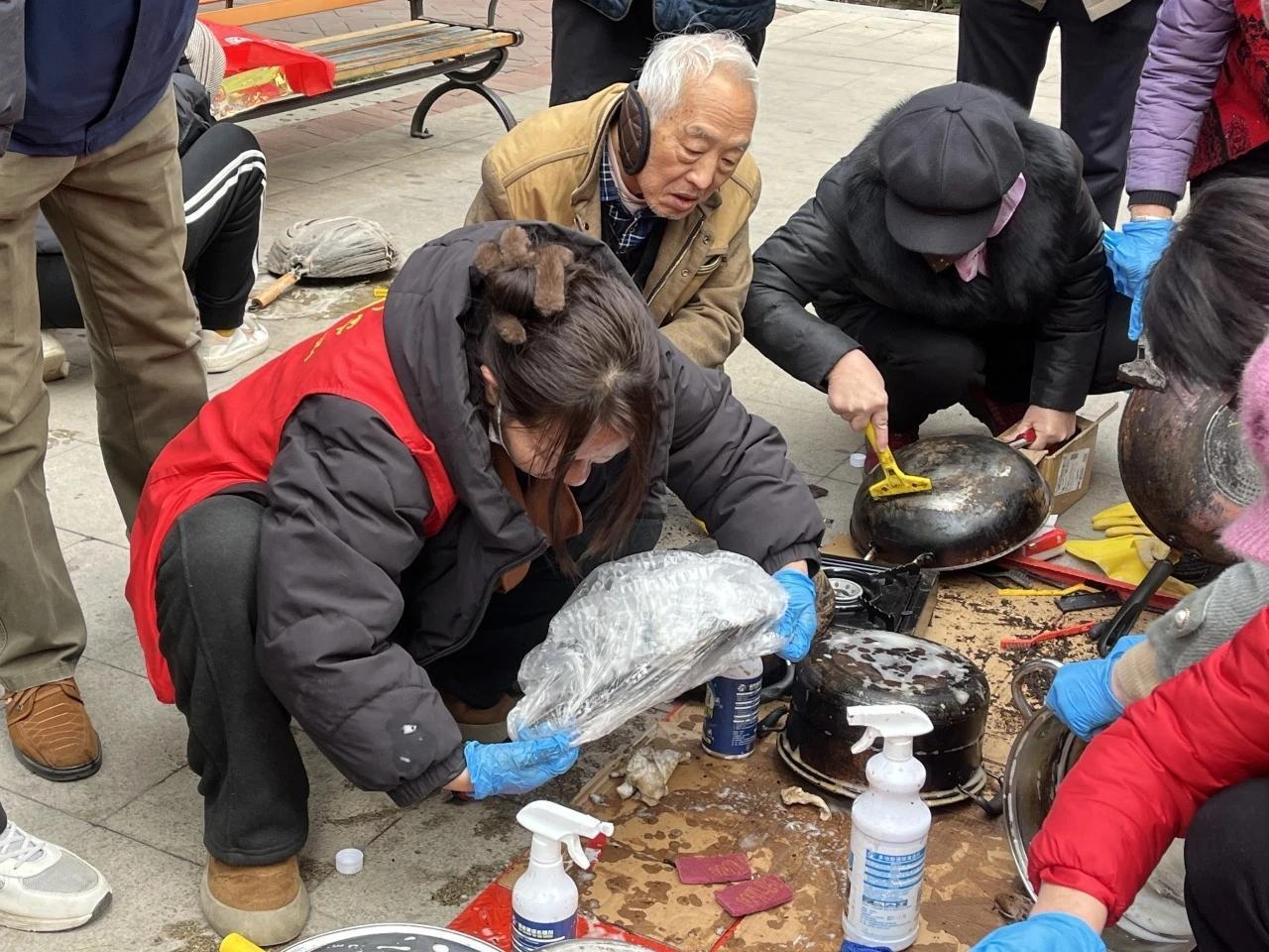 洗锅服务备受居民青睐。志愿者运用专业的清洗技巧和工具,对锅具进行全方位的清洗,并向居民们讲解锅具不及时清理带来的安全隐患、厨房用品的使用技巧以及养护厨具的小妙招等知识。很快,被油渍和污垢侵蚀得失去光泽的锅具重焕生机。