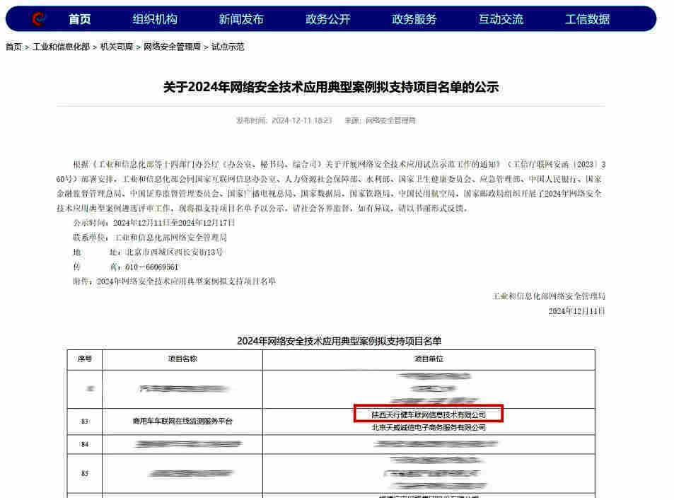 近日,工业和信息化部公示了2024年网络安全技术应用典型案例拟支持项目名单。经开区企业天行健车联网公司申报的“商用车车联网在线监测服务平台”项目,凭借卓越的创新性和实践价值成功入选。