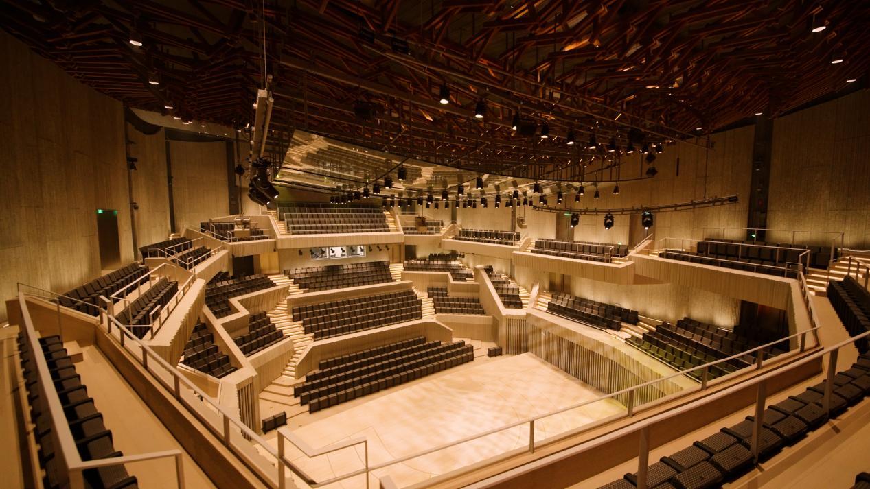 此次启用的音乐厅座席数约1300座,舞台配置12部升降台,灯光、音视频均采用先进的技术设备,可满足大型交响音乐会、室内音乐会等各类音乐盛会需要。除了不同规格的专业表演厅院,西安大剧院还规划了大面积的绿地、连廊、广场,为市民和游客提供散步、交流、精神休憩的空间。