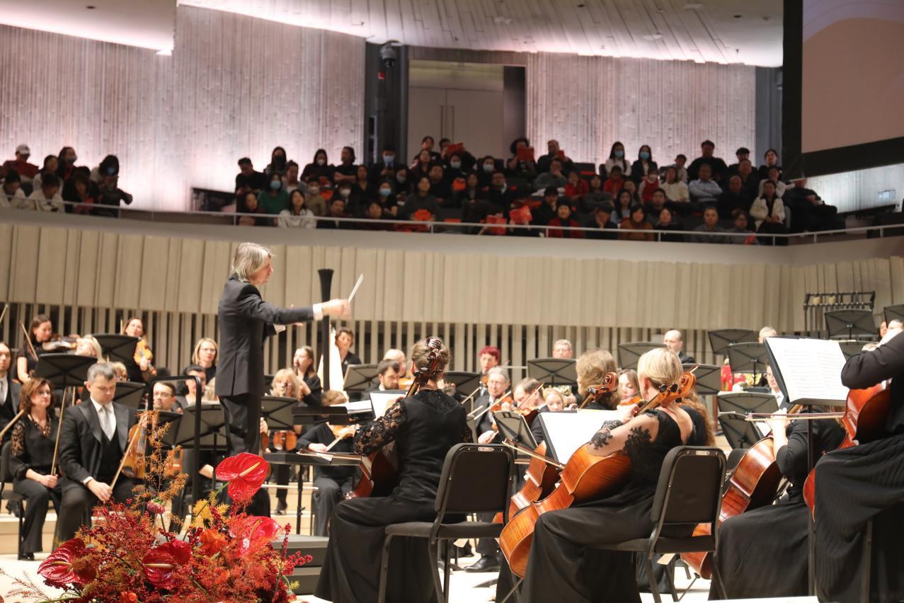 此次音乐会由俄罗斯著名指挥家德米特·瓦希列夫执棒,在他的带领下,乐团先后演奏了《皇帝圆舞曲》《闲聊波尔卡》《春之声圆舞曲》《维也纳气质圆舞曲》等多首维也纳新年音乐会的经典之作。而当《春节序曲》明快、欢乐的旋律响起,更是瞬间将观众拉进充满年味儿的节庆场景中,大家在熟悉的旋律中感受浓厚的新年气氛和中西文化的交融与碰撞。