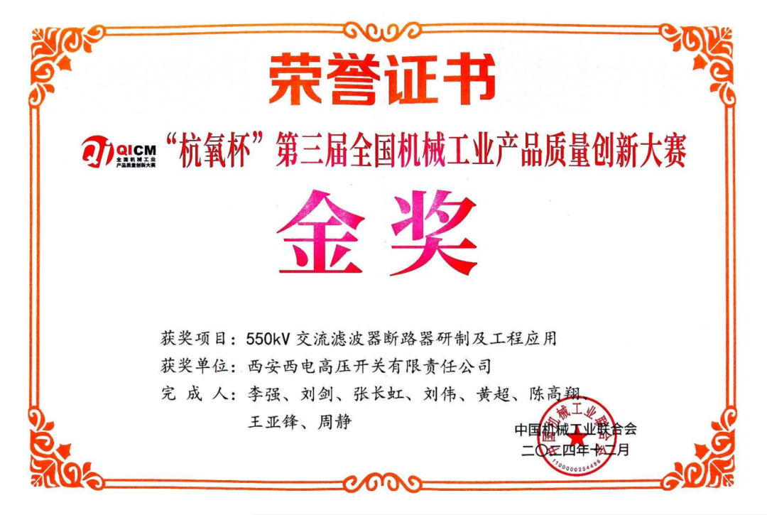近日,由中国机械工业联合会、中国机械工业集团有限公司联合主办的“杭氧杯”第三届全国机械工业产品质量创新大赛圆满落幕。经开区企业西开有限“550kV交流滤波器断路器研制及工程应用”项目斩获金奖。