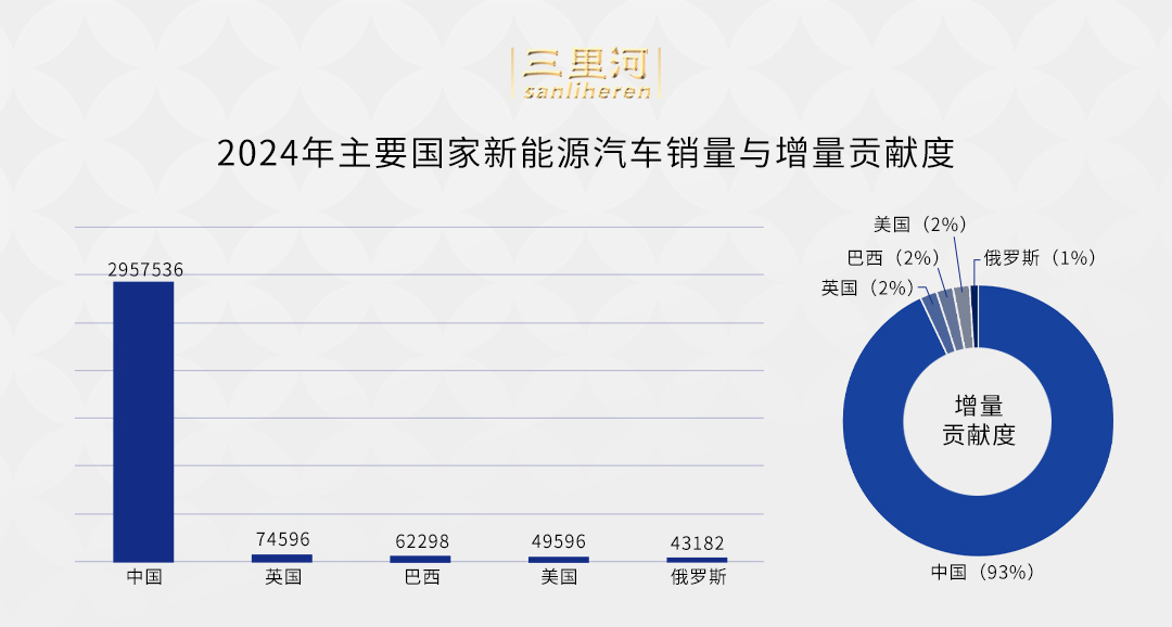 “2024年中国新能源乘用车销量对世界的增量贡献度是93%,英国、巴西、美国都是2%,俄罗斯1%,所以整个世界新能源车总体的增量贡献基本就是在中国。”