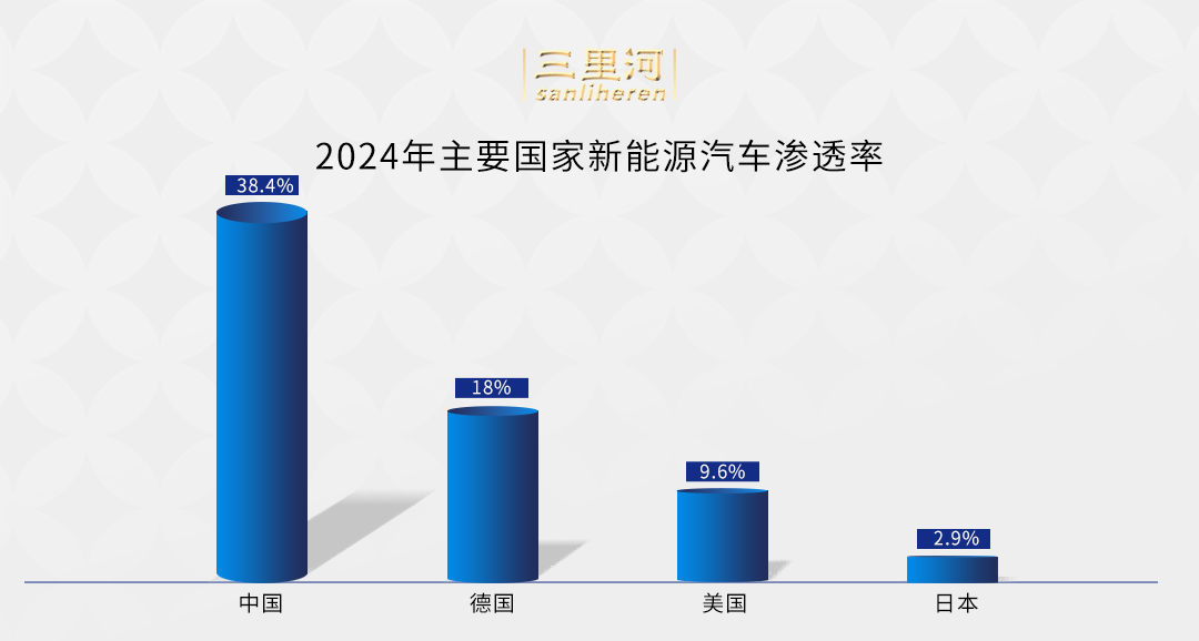 崔东树提供的数据显示,2024年,中国新能源汽车渗透率达到38.4%,德国达到18%,美国仅有9.6%,日本仅有约3%。世界汽车产业格局正发生变化。