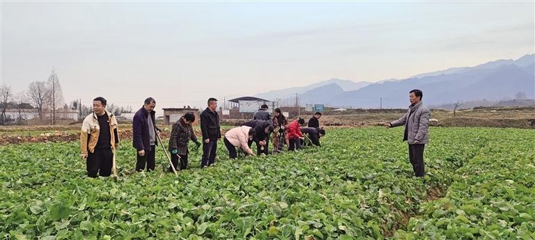 在汉阴县平梁镇新河村的油菜示范田,李成军(右)给农户讲解除草、间苗技巧(资料照片)。