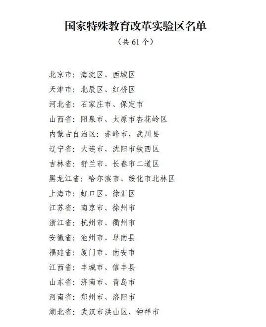 经各地自主申报、省级推荐、网络公示等环节,教育部认定北京市海淀区等61个国家特殊教育改革实验区,西安市雁塔区、宝鸡市眉县位列其中。
