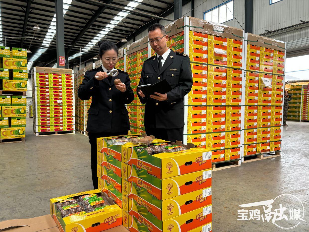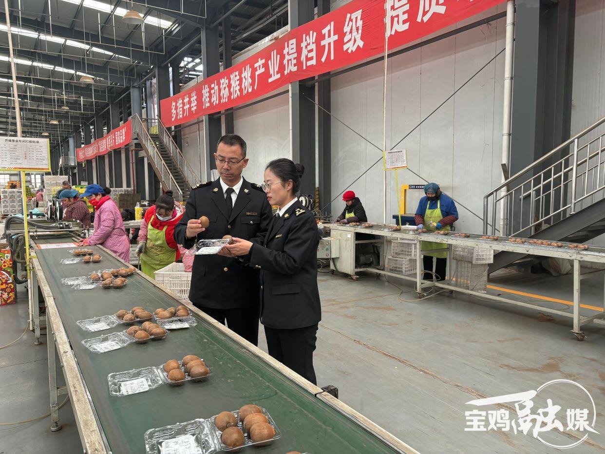 近日,在眉县齐峰果业有限责任公司包装车间内,一筐筐即将出口智利的猕猴桃整齐排列,宝鸡海关工作人员正忙碌地进行查验,确保水果顺利发往海外。
