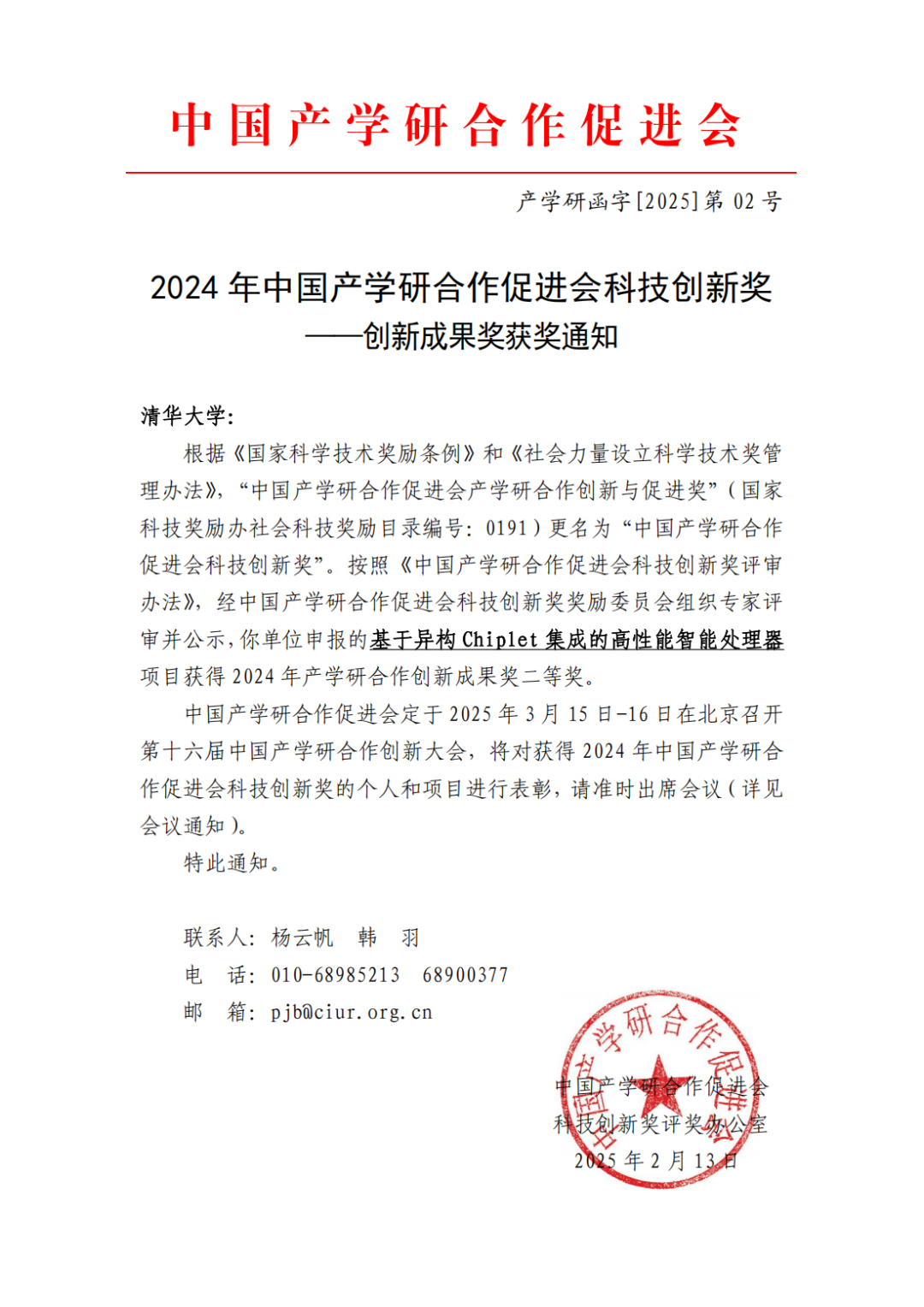 近日,中国产学研合作促进会发布科技创新奖——创新成果奖获奖通知,由清华大学、交叉核心院、北极雄芯共同申报的“基于异构Chiplet集成的高性能智能处理器”项目获得2024年产学研合作创新成果奖二等奖。