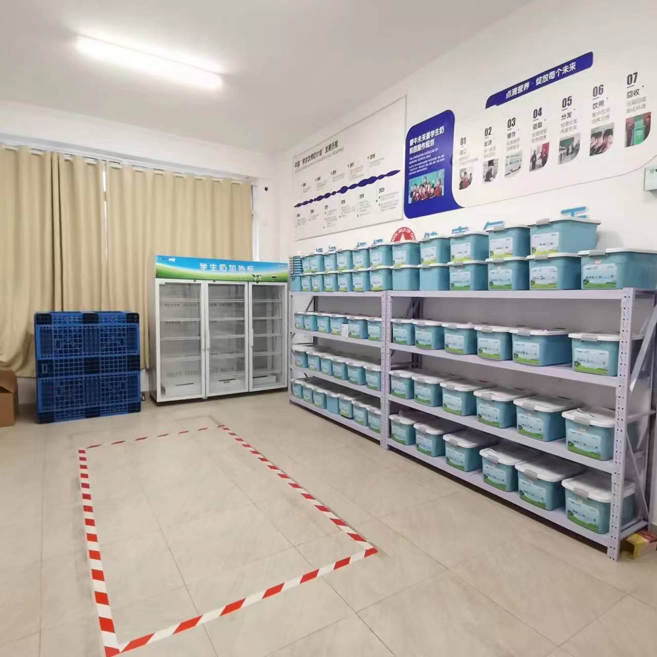 记者在宝鸡市高新区第十小学看到,学校为确保学生饮奶安全,积极采用高效、环保的消毒方法,对奶屋内的每一个角落进行了彻底的清洁与消毒,包括但不限于奶架、冷藏设备及地面等,以确保奶制品的储存环境达到最高卫生标准,为同学们的健康成长提供坚实的支持。