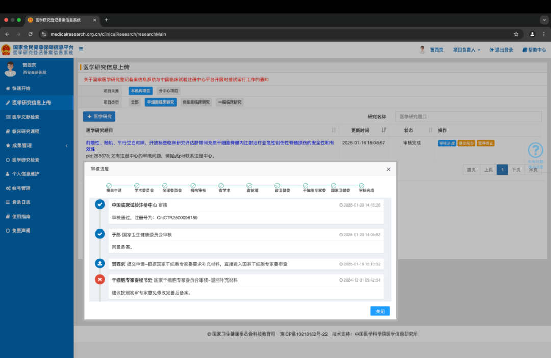 据了解,国内的干细胞临床研究,需要同时获得国家卫健委和国家药监局两个委局的备案批准,审批过程相当严格:项目首先要经过省级卫健委和药监局严格审查后,再报送国家两委局备案,评审前,中国食品药品检定研究院对干细胞制备过程中的流程、设备、人员技术、细胞质量进行严格评审,此后两委抽取全国该专业领域的权威专家进行评审,最终才有获批的资格。其中流程审核、技术评审、伦理评审等环节,每个环节的专业性强、技术难度大。此次西安国际医学旗下医院申请的《前瞻性、随机、平行空白对照、开放标签临床研究评估脐带间充质干细胞脊髓内注射治疗亚急性创伤性脊髓损伤的安全性和有效性》(简称“间充质干细胞移植治疗脊髓损伤”)临床研究项目最终完全达到要求,顺利通过国家卫健委和国家药监局审核备案,标志着西安国际医学干细胞研究得到国家卫健委的充分信任和认可,也为后续院内开展多项干细胞临床研究提供了规范化的平台。