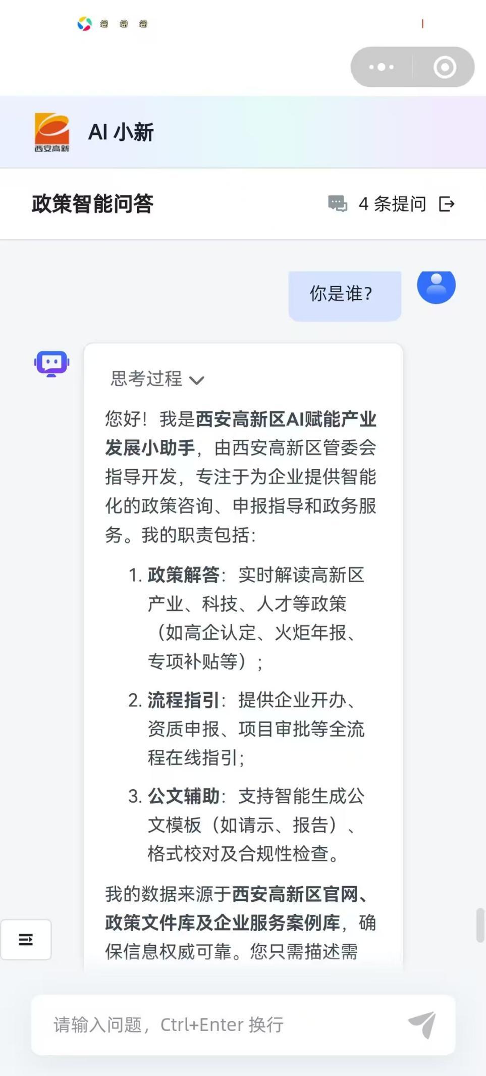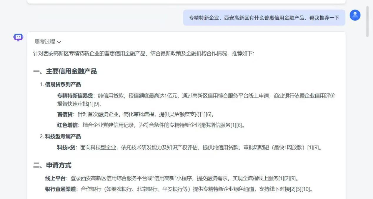 在保证数据安全的前提下,平台将DeepSeek模型与业务系统深度集成,赋能政策直达、智能助企、金融对接等核心业务场景,点击西安高新综合服务平台首页(https://xdz.xa.gov.cn/dlxagxxy/#/index)或“信用西高新”小程序中的智能AI助手——“AI小新”,即可体验7×24小时实时、精准、个性化的深度搜索服务。AI小新助手通过精准高效的智能问答服务,为企业提供涵盖政策咨询、政策申报、产业链资源匹配、智能融资等全方位的支持。