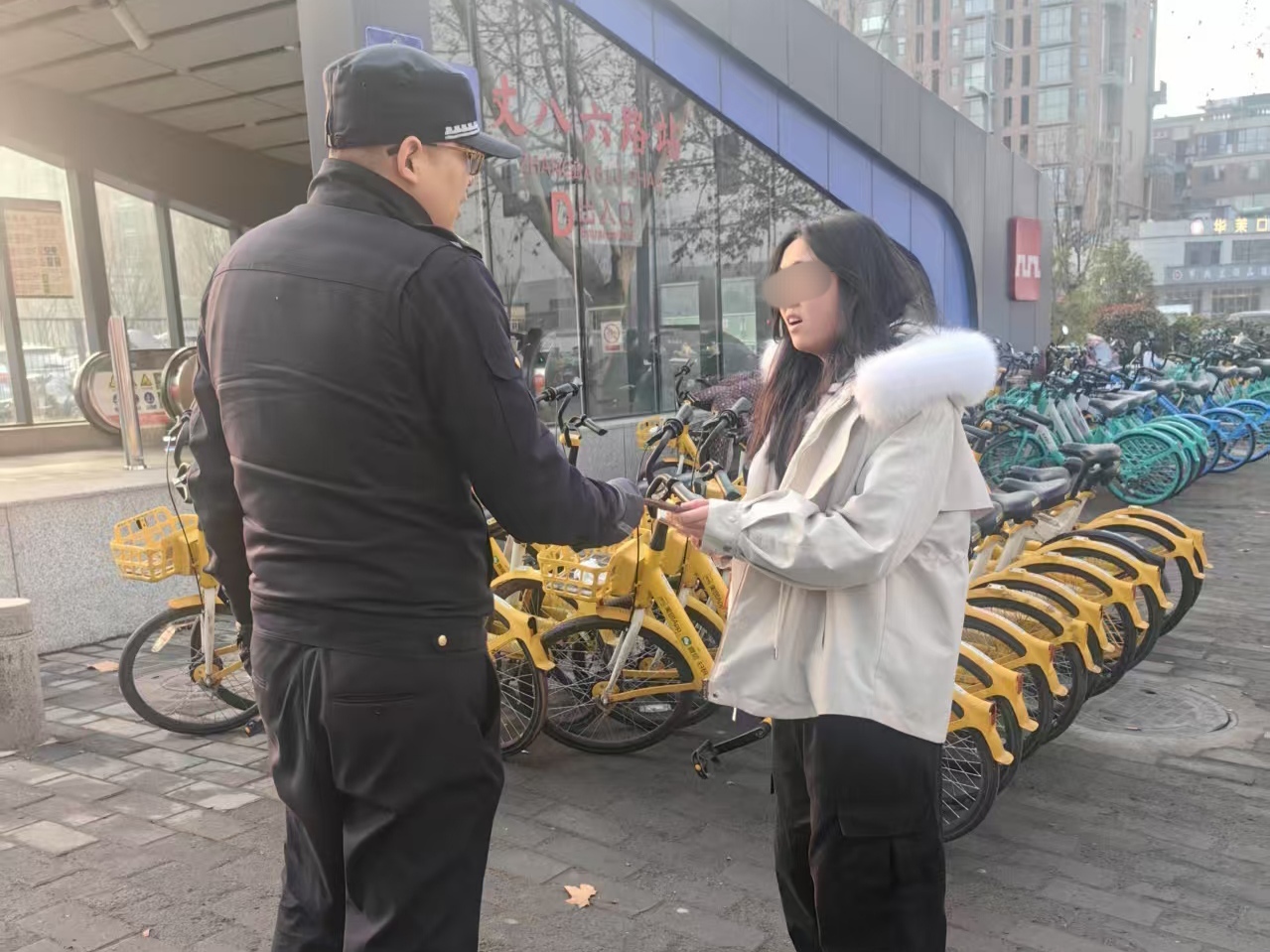 3月6日上午8时左右,高新城管丈八执法中队执法人员全佳磊和同事一起,对丈八六路地铁站周边非机动车停放秩序进行整治。当全佳磊在地铁站D口规整共享单车时,看见人行道上掉落了一部手机,他立即捡起查看,发现手机虽然有锁屏密码,但并未关机。此时,他想到失主丢失手机肯定非常着急,一定回来寻找,就没有走远,继续在地铁站附近规整单车,等候失主打电话或者前来寻找。