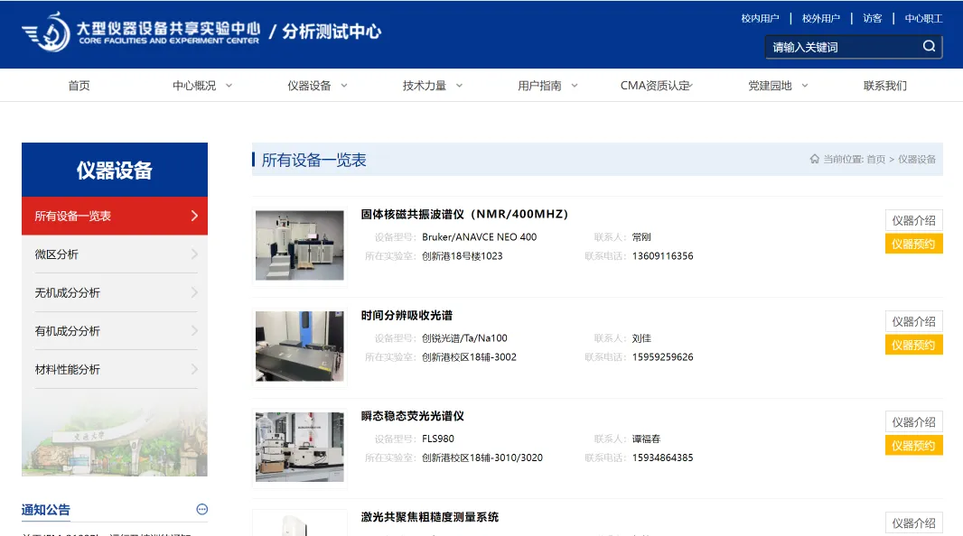 登录大型仪器设备共享实验中心官网,在“仪器设备”栏目下的“所有设备一览表”中,您可以详细查看每台仪器的规格参数和样品要求。