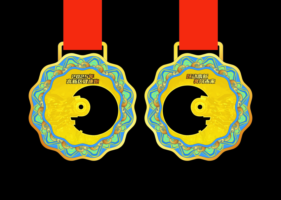 本次职工健康跑奖牌设计以未来之瞳科学公园为元素,展示高新区面向未来、创新创业创造的奋进姿态,以及秦岭山脉的自然壮美与雄伟气势,奖牌融合了未来之瞳独特建筑风格的元素,象征着科技进步与未来发展无限可能。
