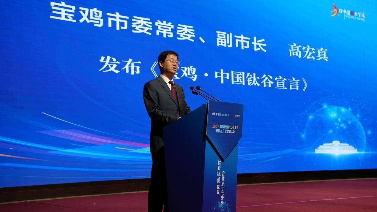 4月22日,在2025年钛锆铪钒分会年会暨钛谷产业发展大会上,宝鸡市委常委、副市长高宏真发布《宝鸡・中国钛谷宣言》。