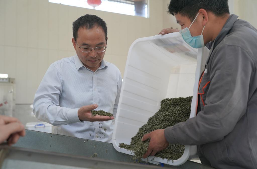 中国农科院茶叶研究所研究员曾建明(左一)在紫阳县指导茶叶生产加工。新华社记者邵瑞 摄