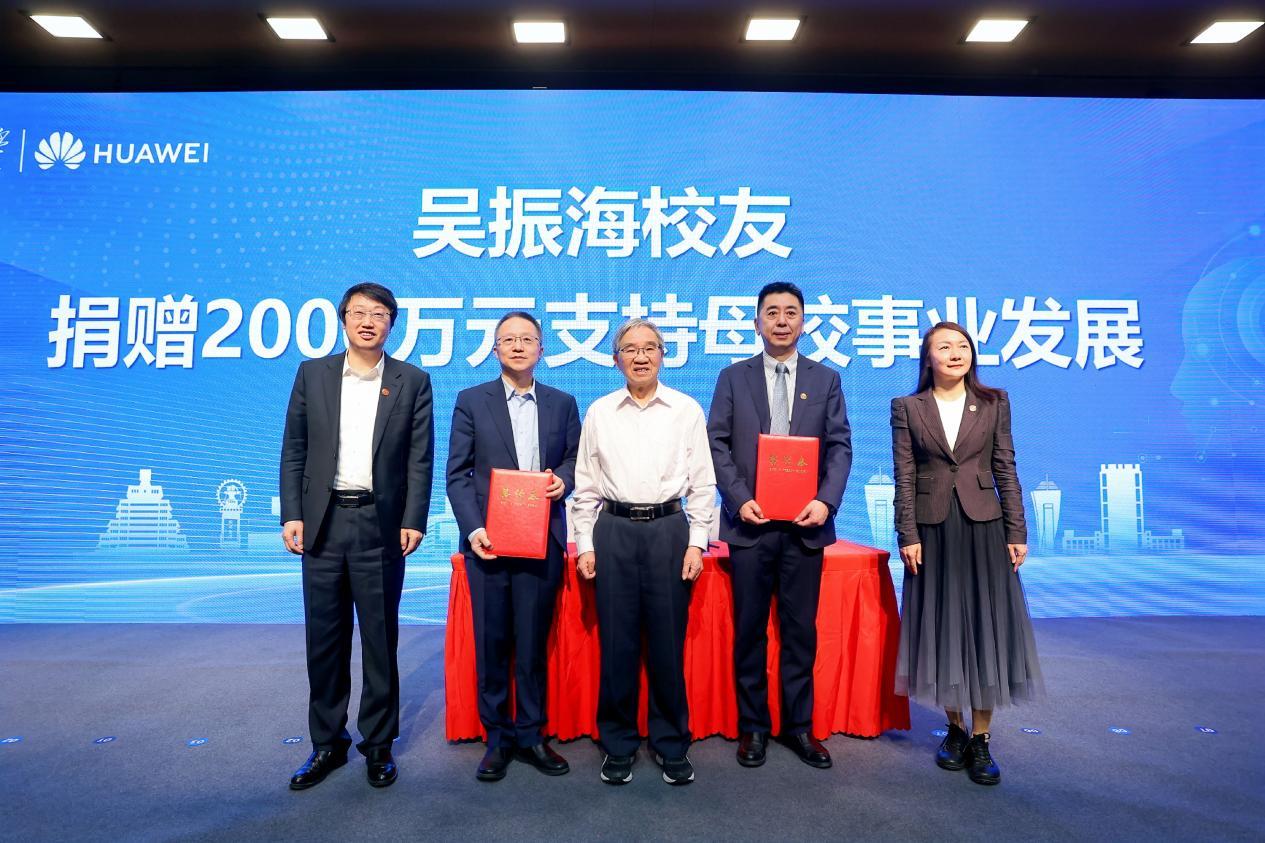 洪军代表学校与吴振海签署捐赠协议,张立群、冯博琴、电信学部党委书记梁莉见证签约。