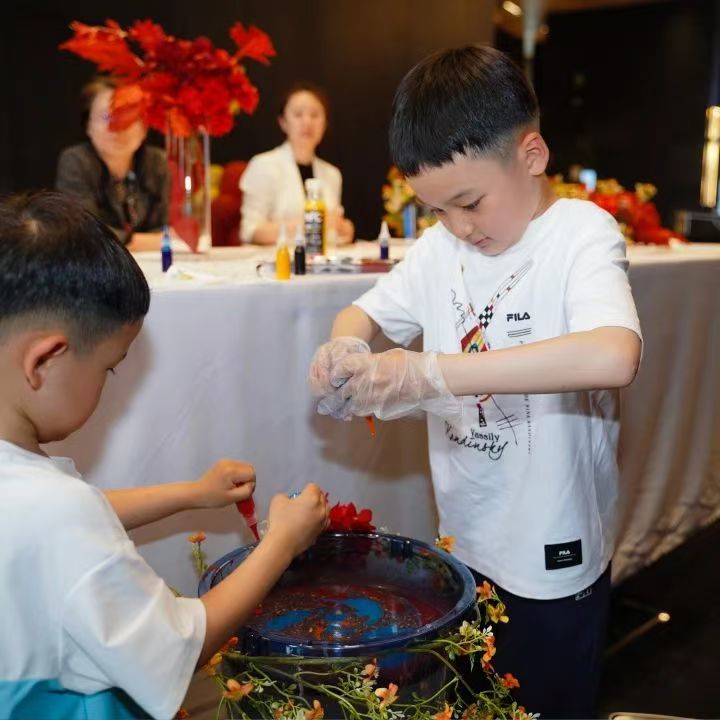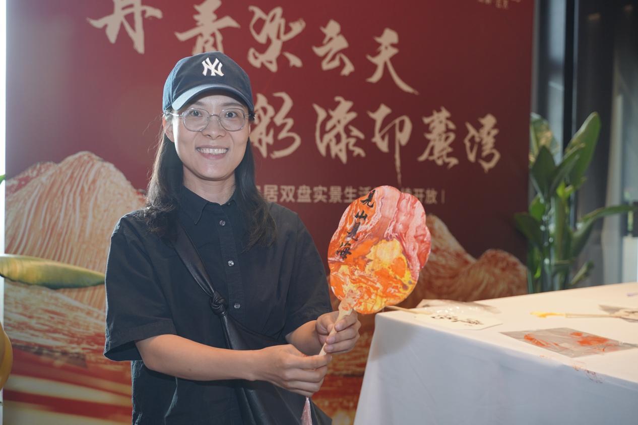 在高科麓湾营销中心,活动以“漆扇印韵:湖光水色中的自然拓印”为主题,通过漆料在清水中晕染渐变,让参与者轻按素扇拓印水波纹理,或自由叠加几何色块。来客探讨湖景与户型布局的呼应,孩童高举成品与实景图合影,一方漆扇,拓印未来湖居生活的灵动想象。