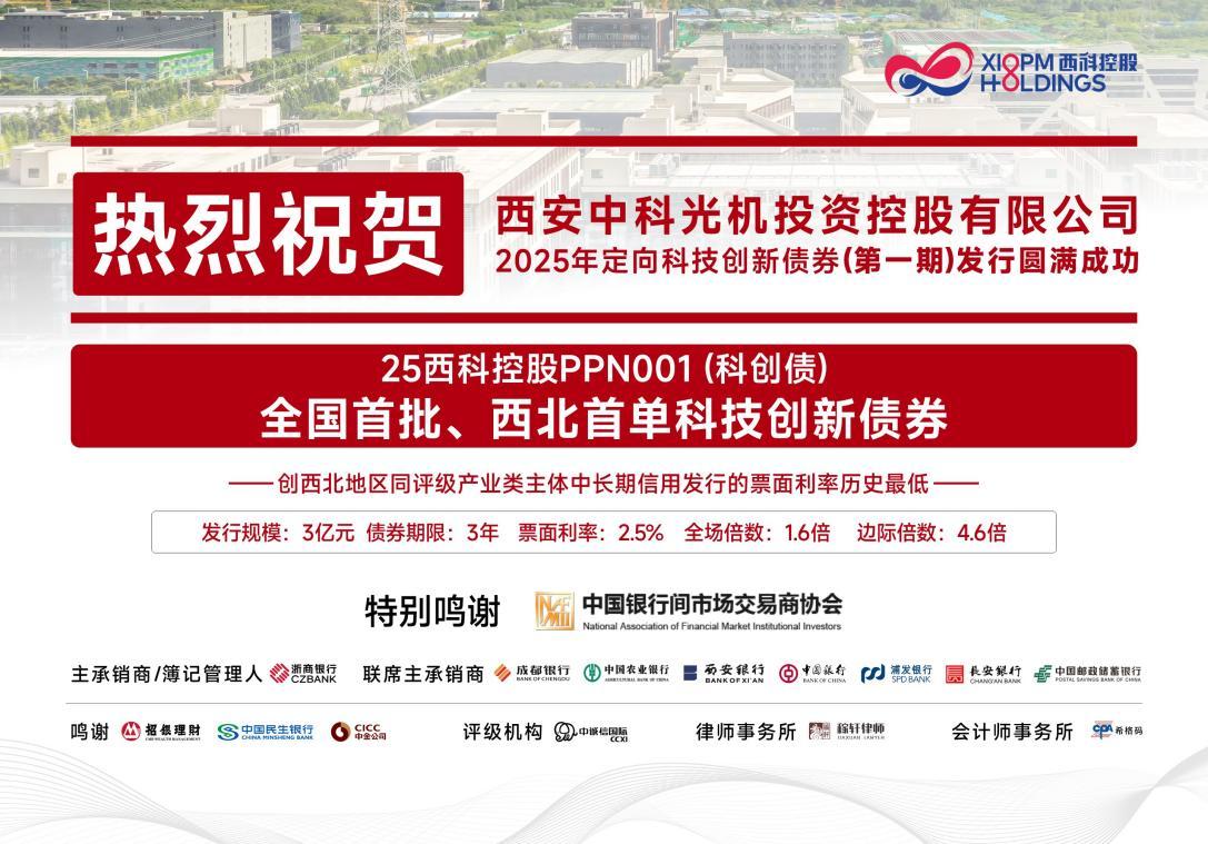 5月12日下午,西安中科光机投资控股有限公司(简称“西科控股”)在中国银行间债券市场成功发行2025年度第一期定向科技创新债券——25西科控股PPN001(科创债)。作为科技创新债券全国首批项目之一,西科控股也是西北地区唯一参与首期科技创新债券的企业。