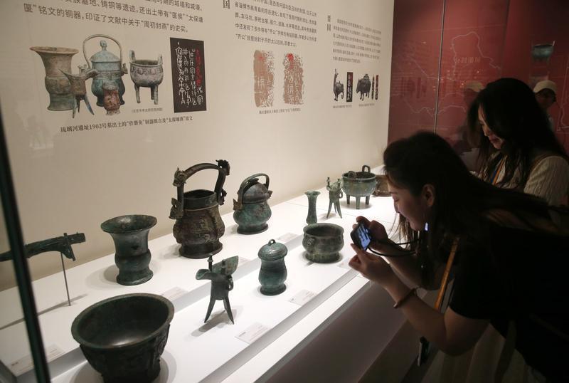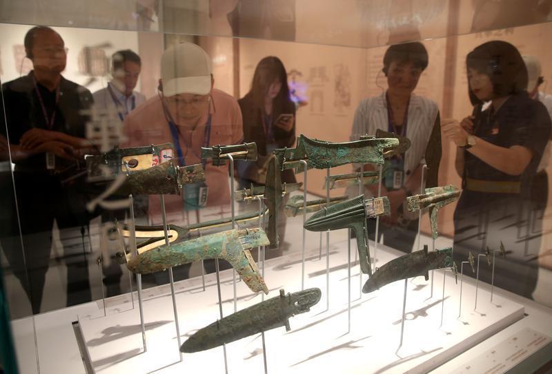 “吉金·中国——中国青铜文明的兴起与繁荣”展览展出的商代青铜兵器吸引了游客驻足观赏
