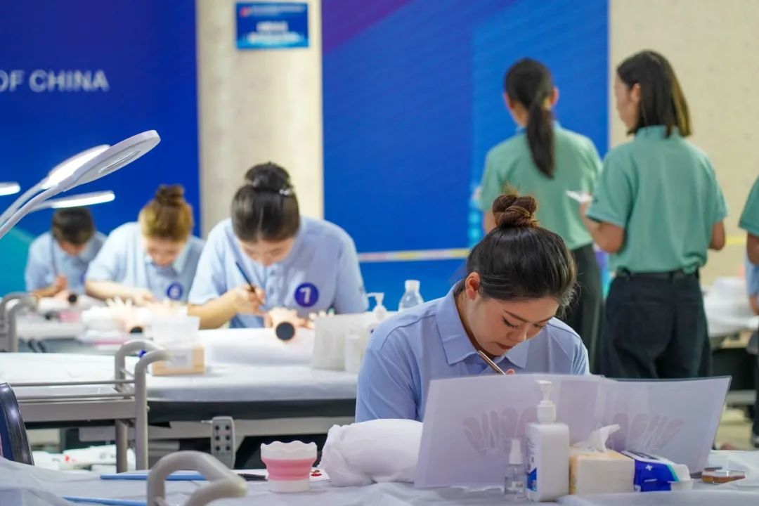 赛场上,选手们手法娴熟、专注投入:从面部清洁的细节把控,到新娘妆造的艺术创意,再到美甲工艺的精雕细琢,每个环节均展现出行业新生代精益求精的职业素养。