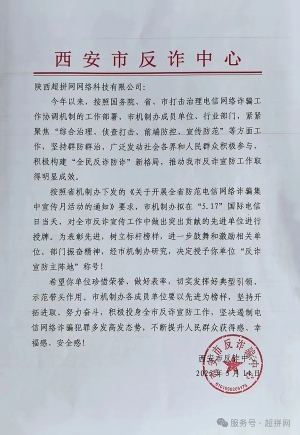 本次表彰活动由西安市反诈中心依照国家、省、市打击治理电信网络诈骗工作部署组织开展,旨在落实“综合治理、前端防控、侦查打击、宣传防范”四位一体的反诈体系建设。超拼网凭借扎实的用户防诈教育体系、健全的风控机制以及在宣传防范方面的积极创新,成为民营企业中的突出代表。