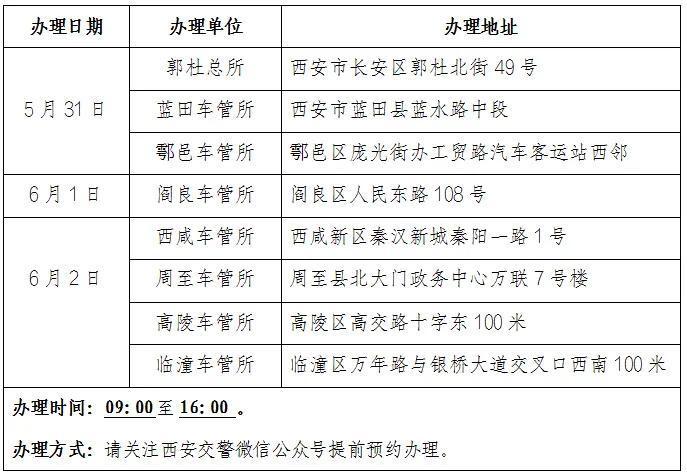 同时,开展交管12123互联网业务办理渠道,实现群众足不出户即可办理车驾管业务。5月31日(周六)至6月2日(周一)8个车管所轮值办理各项车驾管业务。有需要办理车驾管业务的市民朋友,可通过西安交警微信公众号选择日期预约办理。轮值时间和地点如下图:
