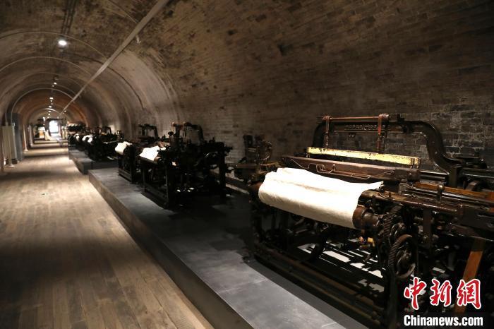 6月7日,陕西宝鸡,记者探访长乐塬抗战工业遗址公园。抗战时期民族工业内迁,1940年宝鸡申新纱厂在此处建成窑洞车间,1941年窑洞工厂正式运转,共有24孔窑洞,支撑了中国西北战区的棉纱供应。图为窑洞内的织布机。中新社记者 张远 摄