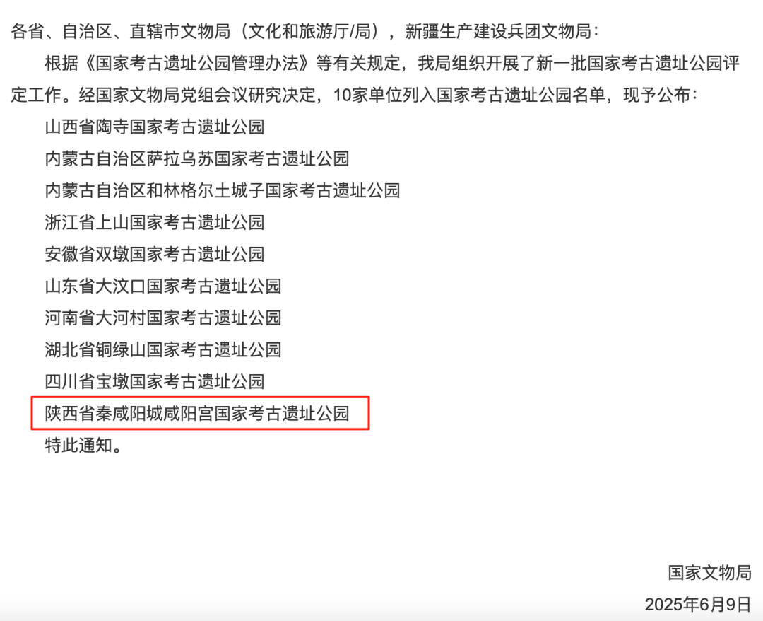 小布了解到,根据《国家考古遗址公园管理办法》等有关规定,国家文物局组织开展了新一批国家考古遗址公园评定工作,从30家申报单位中最终确定10家国家考古遗址公园名单,陕西秦咸阳城咸阳宫国家考古遗址公园入选。