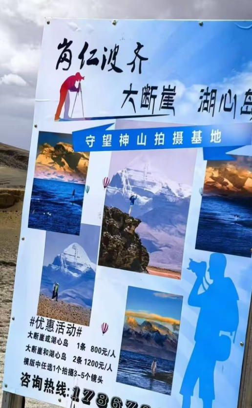 近日,有网友称计划去西藏冈仁波齐大断崖景区旅游,发现当地一公示牌上标识守望神山 拍摄基地 ,拍摄1条大断崖或湖心岛视频收费800元。