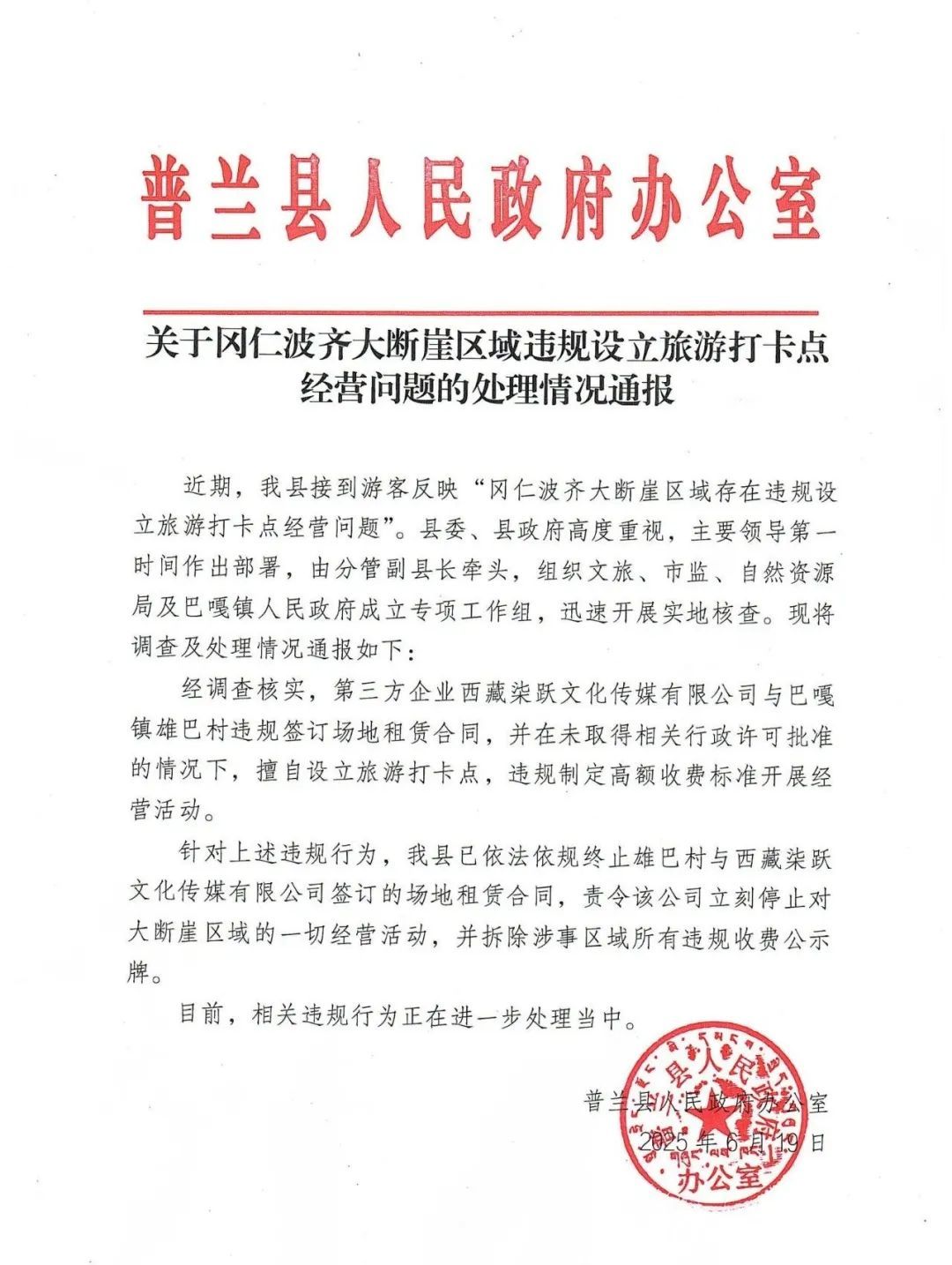 针对上述违规行为,我县已依法依规终止雄巴村与西藏柒跃文化传媒有限公司签订的场地租赁合同,责令该公司立刻停止对大断崖区域的一切经营活动,并拆除涉事区域所有违规收费公示牌。