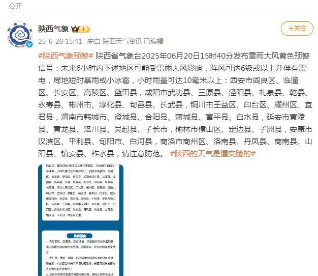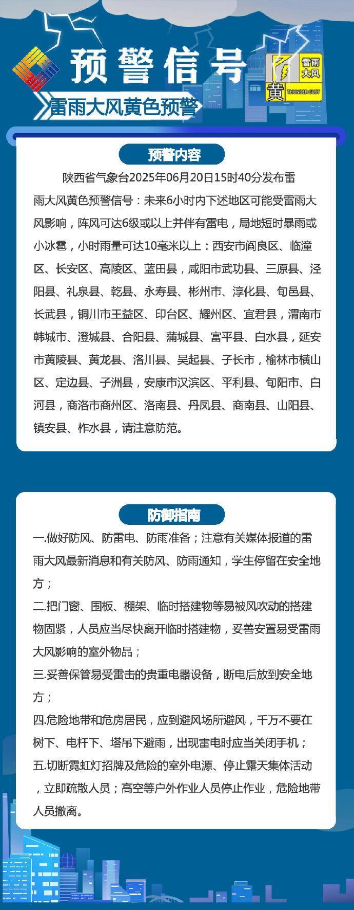 陕西省气象台2025年6月20日15时40分发布雷雨大风黄色预警信号:未来6小时内下述地区可能受雷雨大风影响,阵风可达6级或以上并伴有雷电,局地短时暴雨或小冰雹,小时雨量可达10毫米以上:西安市阎良区、临潼区、长安区、高陵区、蓝田县,咸阳市武功县、三原县、泾阳县、礼泉县、乾县、永寿县、彬州市、淳化县、旬邑县、长武县,铜川市王益区、印台区、耀州区、宜君县,渭南市韩城市、澄城县、合阳县、蒲城县、富平县、白水县,延安市黄陵县、黄龙县、洛川县、吴起县、子长市,榆林市横山区、定边县、子洲县,安康市汉滨区、平利县、旬阳市、白河县,商洛市商州区、洛南县、丹凤县、商南县、山阳县、镇安县、柞水县,请注意防范。