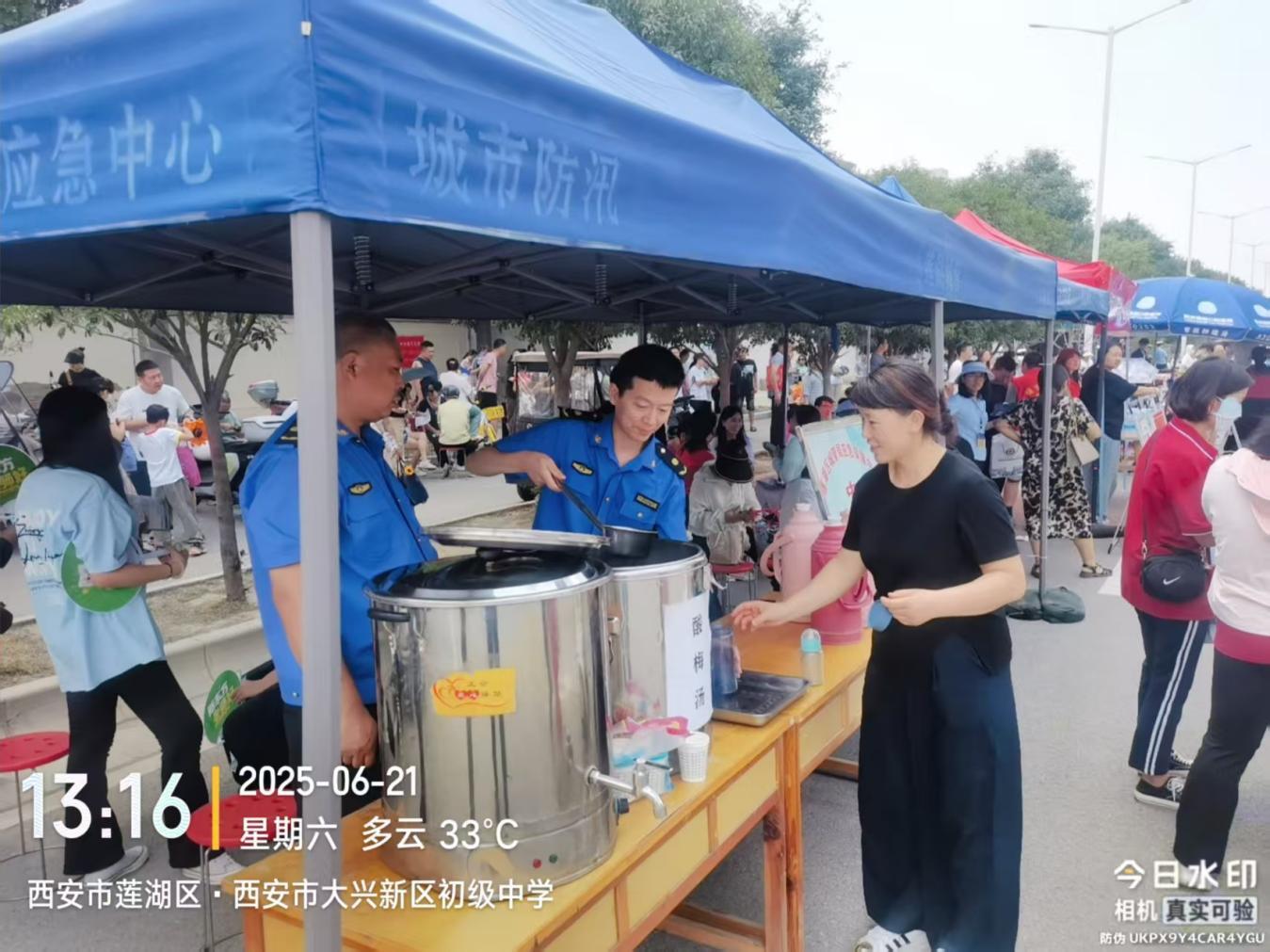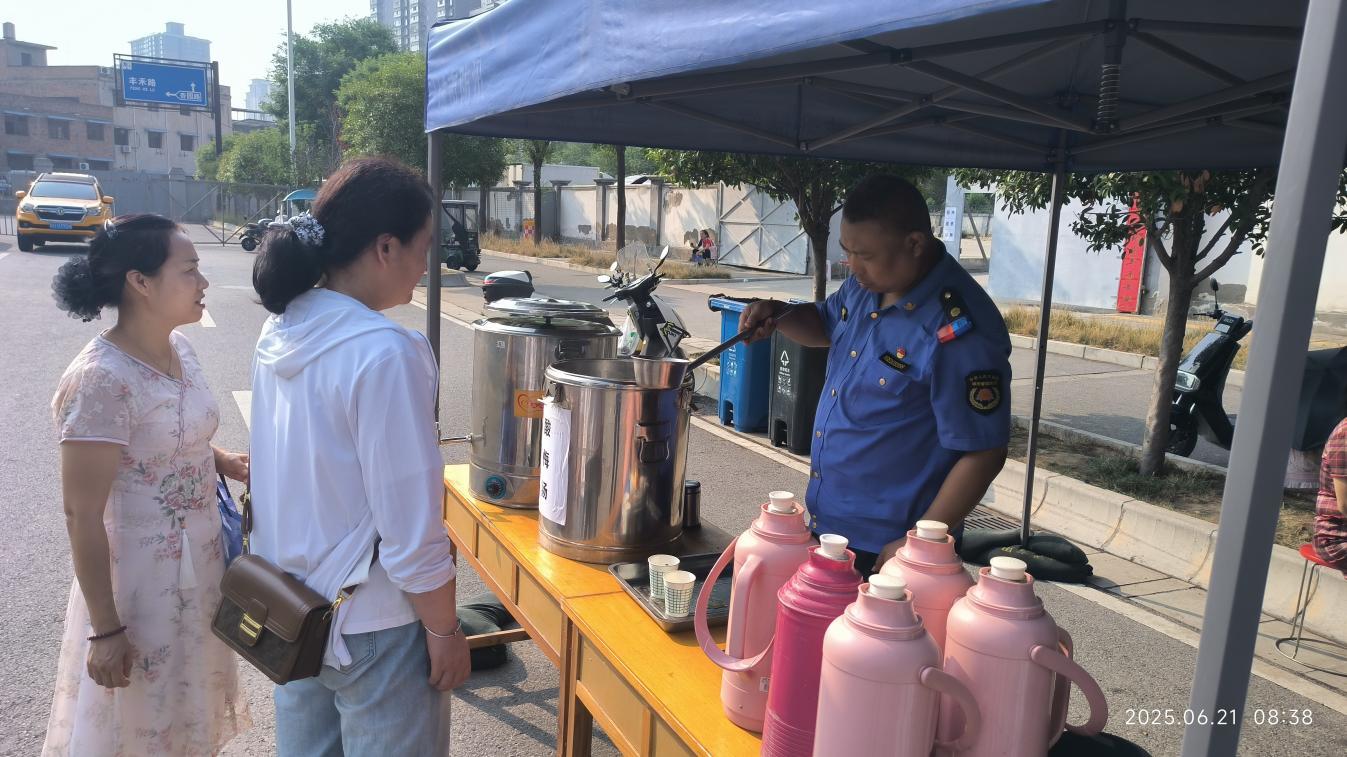 6月21日,莲湖区环卫应急保障中心在大兴新区初级中学考点外,设置“中考爱心服务点”。现场,遮阳帐篷和桌椅板凳有序摆放,为候考考生及陪考家长提供了清凉舒适的休息场所。除了硬件设施的贴心设置,工作人员还准备了消暑解渴的爱心酸梅汤,一杯杯酸梅汤递到考生和家长手中,不仅驱散了酷暑的燥热,更传递着满满的关怀和鼓励。