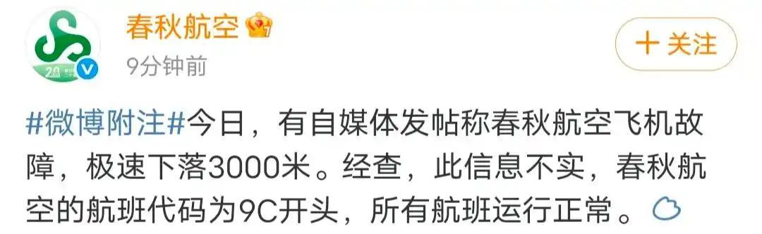 6月30日晚,春秋航空官方发布消息:今日,有自媒体发帖称春秋航空飞机故障,极速下落3000米。经查,此信息不实,春秋航空的航班代码为9C开头,所有航班运行正常。