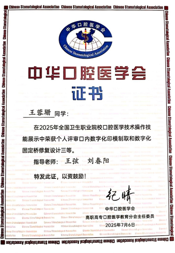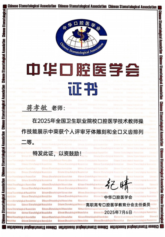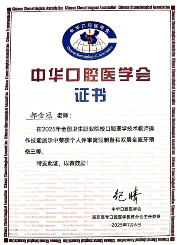 近日,西安医学高等专科学校口腔医学院师生代表在“2025年中华口腔医学会口腔医学教育学术年会技能大赛”中凭借扎实的理论功底、精湛的实操技能和稳定的临场发挥,勇夺教师组二等奖、三等奖及学生组三等奖,为学校赢得了崇高荣誉。