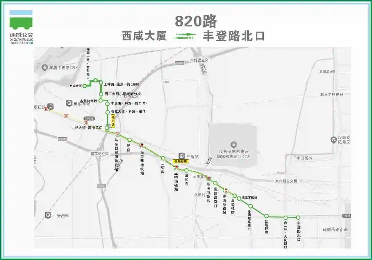 自摆旗寨地铁站始发,经秦直大道、咸宋路、周成路、天工二路至秦汉新城汽车零部件产业园。