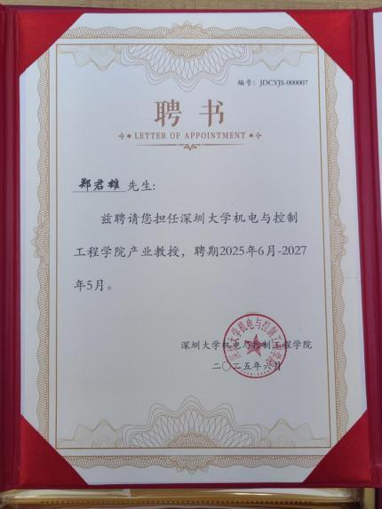 2025年4月以来,经过行业推荐,候选人郑君雄通过了深圳大学机电与控制工程学院的产业教授评审团队的审查,鉴于其在领头创立的光电芯片企业(深圳中科光芯)发展过程中取得的科技和工程的突出成果,最终获得深圳大学机电与控制工程学的最高学术委员会会议一致审议通过,正式聘请郑君雄博士为机电与控制工程学的产业教授。