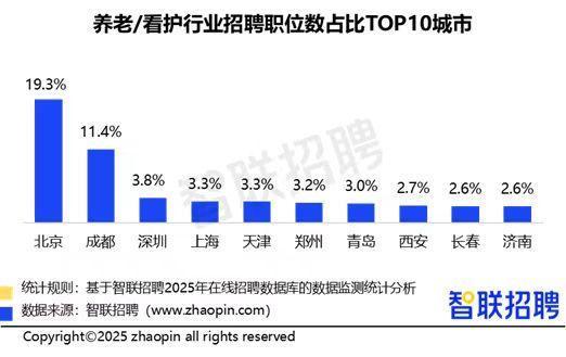 近日,智联招聘发布的《2025年二季度人才市场热点快报》显示,在养老看护行业招聘职位数占比TOP10城市中,西安位列第八,占比2.7%,成为西北地区该领域人才需求的重要阵地。