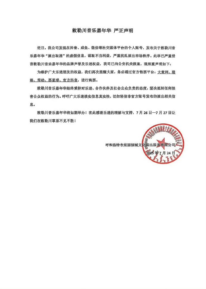 据多名网友发布的信息显示,7月24日,主办方曾发布严正声明,否认“演出取消”传闻,强调音乐节将如期举办,并称已向公安机关报案。九派新闻发现,该声明在其官博上已搜索不到,疑似已被删除。