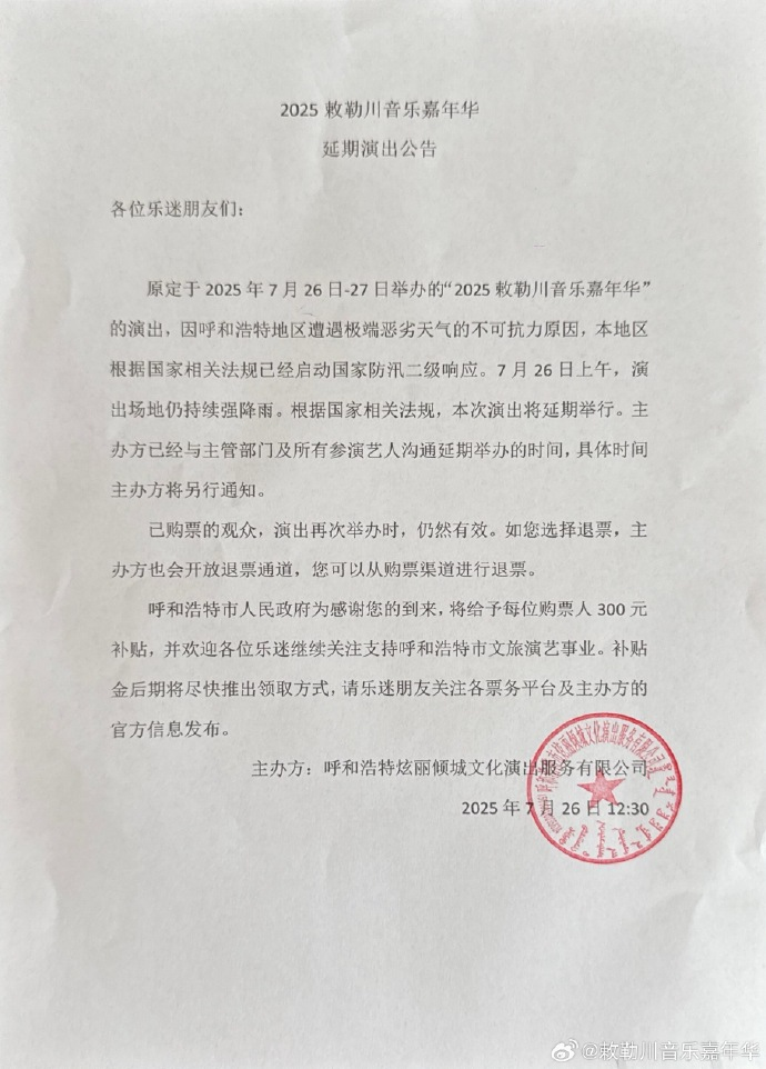 原定于2025年7月26日-27日举办的“2025 敕勒川音乐嘉年华”的演出,因呼和浩特地区遭遇极端恶劣天气的不可抗力原因,本地区根据国家相关法规已经启动国家防汛二级响应。7月26日上午,演出场地仍持续强降雨。根据国家相关法规,本次演出将延期举行。主办方已经与主管部门及所有参演艺人沟通延期举办的时间,具体时间主办方将另行通知。