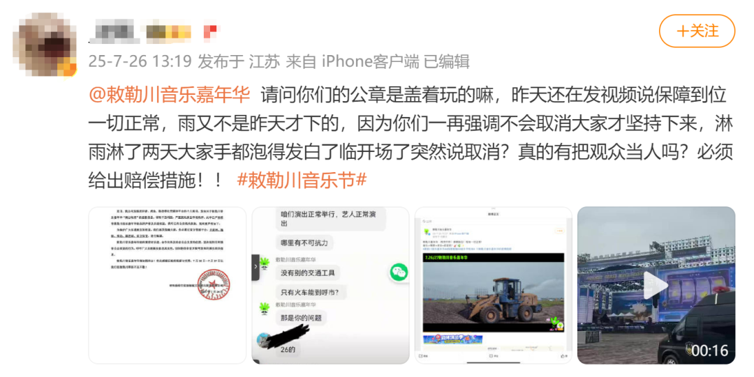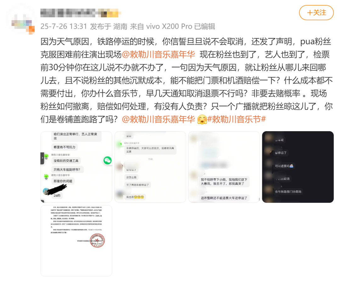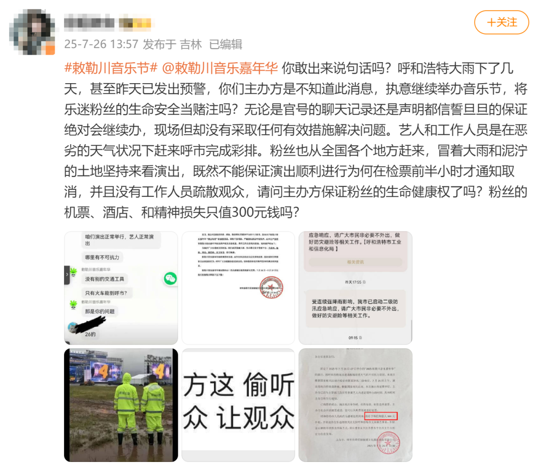 原标题:呼和浩特一音乐节开场前不到1小时宣布延期,主办方称每人补偿300元,此前无视天气预警多次否认演出取消