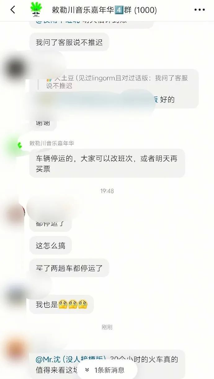 网友还爆料称音乐节主办方此前在粉丝群里保证“演出正常举行,艺人正常演出,没有不可抗力”,甚至表示“火车停运可以改班次”。