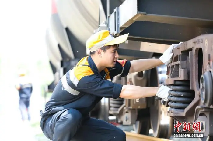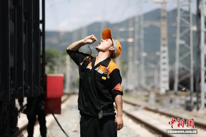 中新网陕西安康7月29日电(张远 吴超)29日正午,陕西安康东编组场内的铁路钢轨烤得通红,热浪扑面而来。不远处,安康车辆段货车检车员刘明鑫手中的手电在车轮间不断晃动,金属敲击声有序传来,汗珠顺着他的脸颊滑落,在下巴悬垂片刻,“啪嗒”落在了65℃的钢轨上。