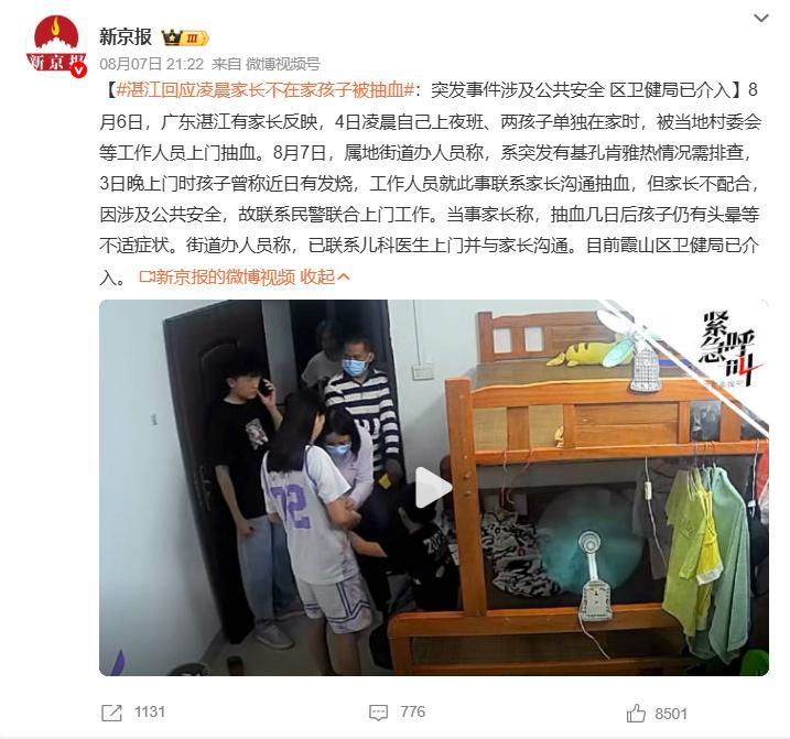 原标题:广东湛江回应“凌晨家长不在家孩子被抽血”:突发事件涉及公共安全,区卫健局已介入
