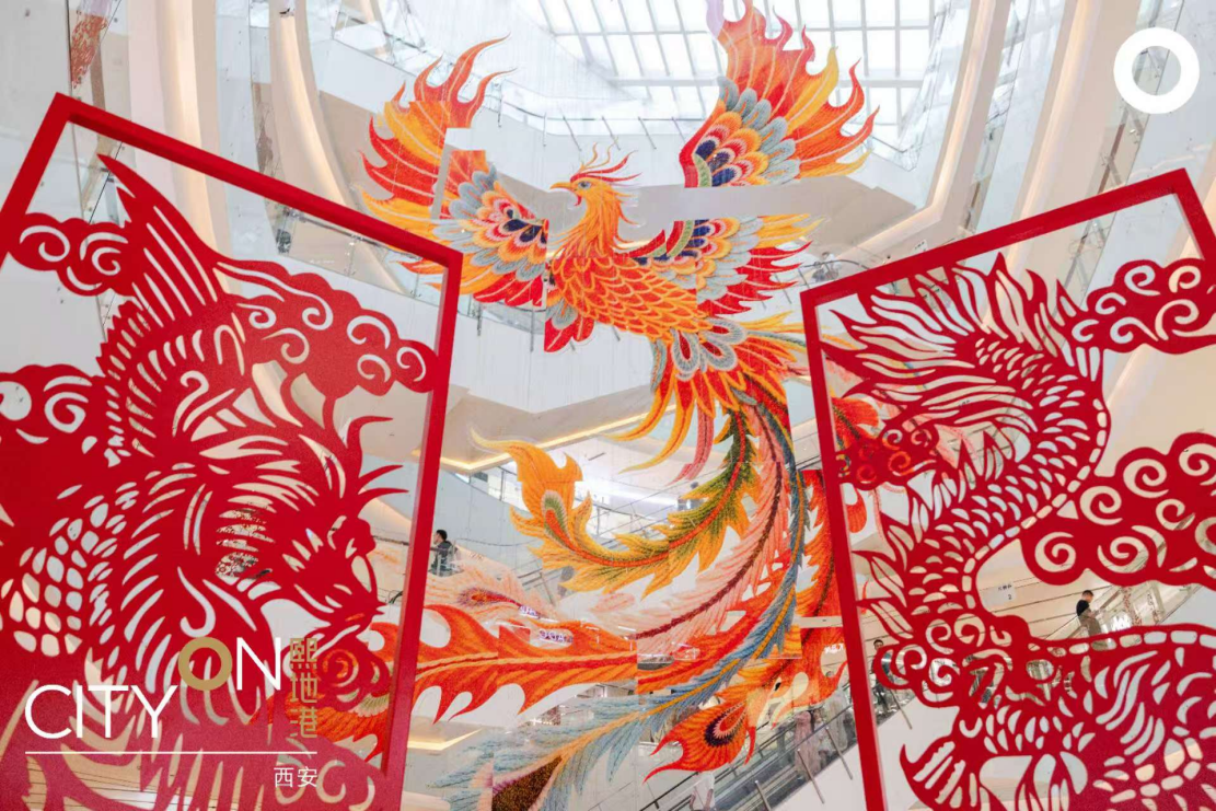 此外,《龙凤和鸣》艺术空间是最具巧思的打卡点。西安熙地港将传统陕西剪纸非遗技艺转化为“网红装置”,利用现代商业空间与非遗美学的碰撞,植入炽热的非遗符号,制造视觉与文化的双重反差。通过框架式结构构建的场景,既让顾客可穿梭其中实现“人与非遗的互动”,又能在打卡拍照时呈现“人在画中游”“龙凤相伴其身”的美好意境,在这个暑期将带给全国消费者独特的展出体验。