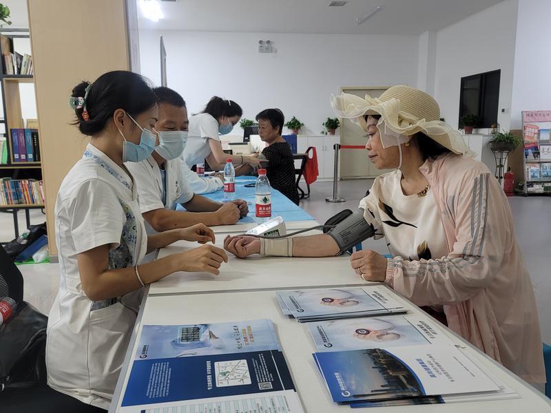 义诊现场,医护人员给老人测血压。